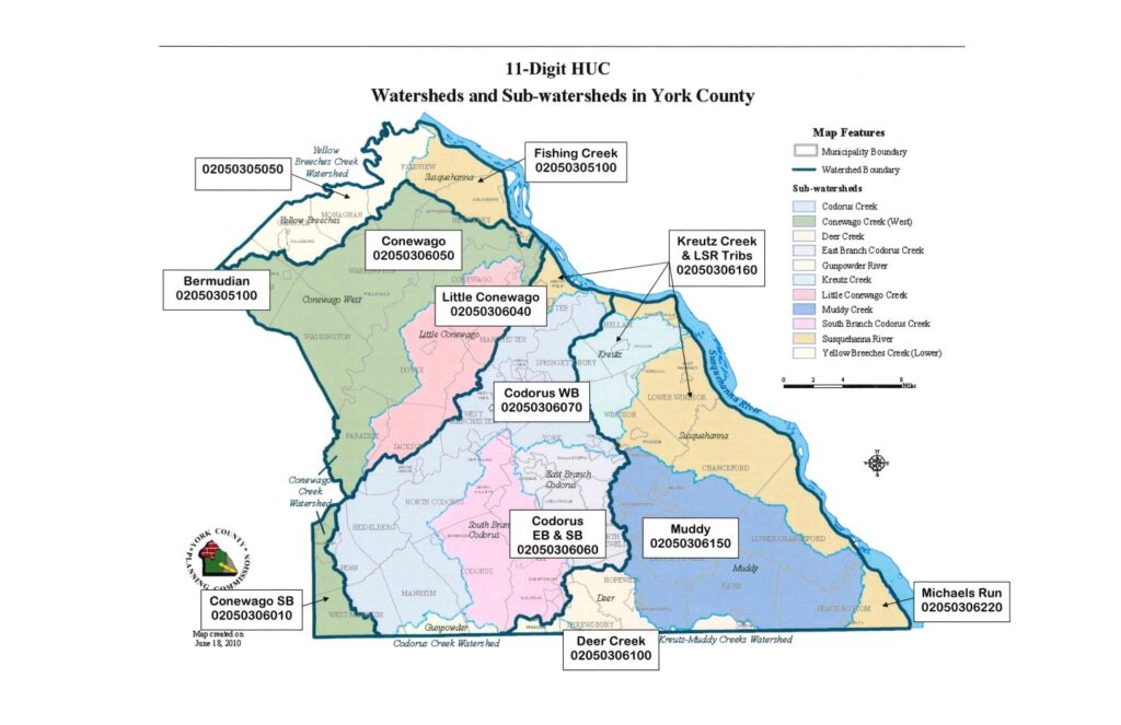 A watershed is the area of land that drains to a specific body of water, whether a stream, pond, lake, river, or ocean. A watershed area can be as large as the many states or as small as a creek running through a meadow. Watersheds can be broken down into smaller watersheds which can be further broken into even smaller watersheds. All of York County falls into the Susquehanna River watershed which in turn is part of the Chesapeake Bay watershed. The map at the bottom illustrates the principle watersheds in the county.